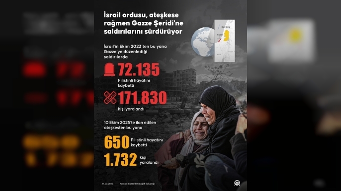 İsrail'in Ekim 2023'te Gazze Şeridi'ne başladığı saldırılarda toplam can kaybının 72 bin 135'e, yaralı sayısının 171 bin 830'a yükseldiği bildirildi.