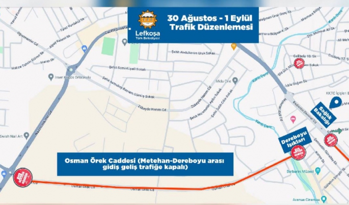 Lefkoşa Türk Belediyesinden verilen bilgiye göre, Bedrettin Demirel Caddesi üzerinde yer alan KIB-TEK binasının 50 metre ilerisinden Açık Öğretim Fakültesi’nin bulunduğu alana kadar olan yol çift şerit trafiğe kapalı olacak. Başbakanlık istikametinden gelen sürücüler Lefkoşa içerisine ulaşmak için Salih Mecit Sokak’a dönüş yapabilecek, Maliye Bakanlığı istikametinden gelen sürücüler de Atatürk Caddesi’nden ilerleyebilecek.